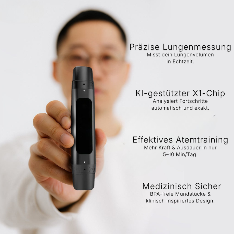 Pulmo Air™ hilft, Atemwege zu reinigen, die Lungenkapazität zu steigern und leichter durchzuatmen – ganz ohne Medikamente.